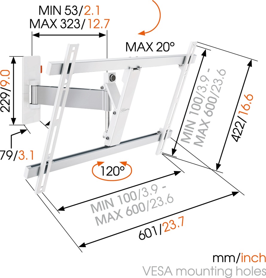 Opis:Stenski nosilec Vogel's W52081 - WALL 2325 je TV sprejemnike z diagonalo od 40'' do 65''. Nosilec se lahko obrne do 120 stopinj z naklonom do 20 stopinj. VESA standard do 600x400mm.