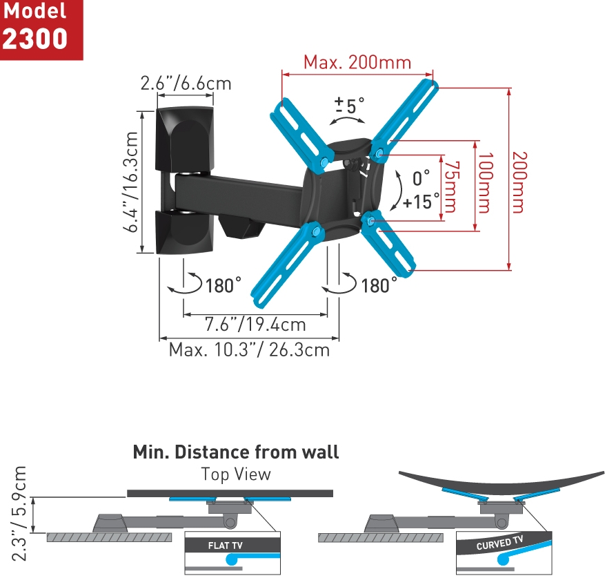 - Min.-Max. razdalja od zida: 5,9 – 26,3 cm