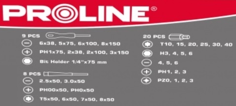 PROLINE 37-delni komplet izvijačev in nastavkov S2 Soft Touch, 10937 je vsestranski set za natančna opravila v delavnici, garaži ali doma. Izvijači so izdelani iz kakovostnega CrV jekla, magnetne konice iz S2 jekla pa zagotavljajo dober oprijem vijakov. Dvokomponentni nedrseči ročaji poskrbijo za udobno in varno delo, komplet pa je mogoče s pritrditvenimi luknjami enostavno namestiti na steno.