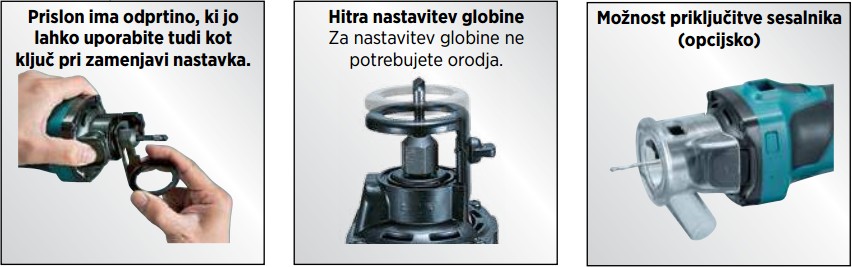 Prislon z integrirano odprtino, enostavno drsno stikalo z zaklepom in hitra nastavitev globine brez orodja olajšajo uporabo. Možnost priključitve sesalnika ter funkcija preprečevanja ponovnega zagona dodatno povečata varnost in čistočo delovnega okolja.
