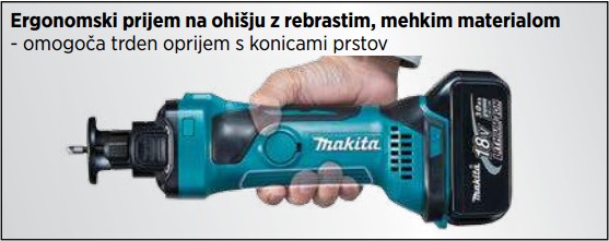 MAKITA akumulatorski nadrezkar DCO180Z je zasnovan za hitro in natančno izdelavo odprtin za vtičnice v mavčnih ploščah na gradbiščih. Visoka hitrost vrtenja omogoča učinkovito rezanje, ozka zasnova ohišja ter ergonomski, z rebrastim mehkim materialom prevlečen prijem pa poskrbita za udobno in varno delo.