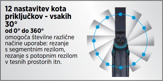 Multifunkcijsko orodje je kompaktno in lahko, zato je idealno za delo nad glavo in v ozkih prostorih. Izjemno ergonomičen oprijem na ohišju omogoča dober nadzor nad orodjem, 12 nastavitev kota priključkov pa poskrbi za natančno prilagoditev delovni nalogi.