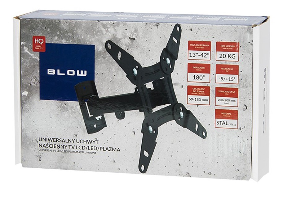 Stenski nosilec BLOW prihrani prostor v sobi in namesti vaš tv sprejemnik direktno na steno. Primeren je za zaslone velikosti 13"- 42" teže do 20 kg. Zagotavlja varno in čvrsto nosilnost za izredno majhno ceno! Z možnostjo nagiba od -5° do +15° omogoča popoln vidni kot tudi, če je TV sprejemnik pritrjen na višjem mestu ter hkrati ščiti televizor pred krajo in padci. S pomočjo gibljive roke je nosilec možno premikati za kot 180°.