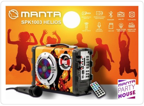 MANTA karaoke zvočnik s mikrofonom HELIOS SPK1003 je prenosni Bluetooth zvočnik, ki poskrbi za zabavo doma, v dvorani ali na prostem. Ponuja kristalno čist zvok, vgrajeno zmogljivo baterijo, priložen mikrofon za karaoke ter možnost priklopa dodatnih mikrofonov in električne kitare. Disco LED lučke in enostavno upravljanje z daljinskim upravljalnikom ustvarijo pravo zabavno vzdušje kjerkoli in kadarkoli.