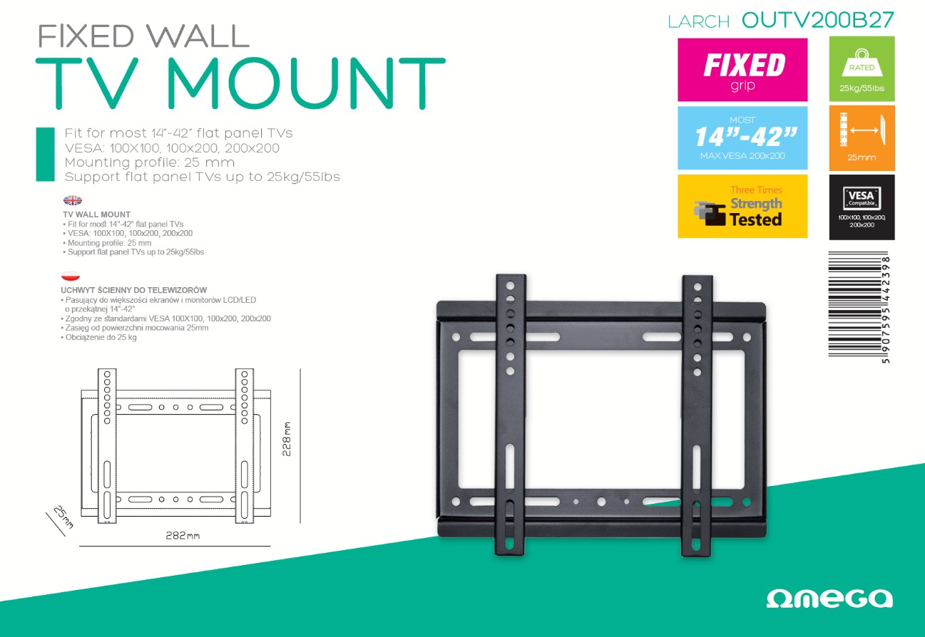 Stenski nosilec priznanega proizvajalca Omega prihrani prostor v sobi in namesti vaš tv sprejemnik direktno na steno. Primeren je za zaslone velikosti 14'- 42' in teže do 25 kg. Zagotavlja varno in čvrsto nosilnost za izredno majhno ceno ter hkrati ščiti televizor pred krajo in padci.