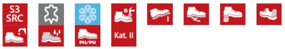 Opis:Cevlji imajo zaščitno kapo in kovinsko podlogo v gumi, ki varuje pred prebijanju in ima antistatične lastnosti. Peta absorbira energijo in je prevlečena ter zavira prepuščanje vode. Močan podplat (dvo-slojni poliuretan) zagotavlja visoko stabilnost obutve in je odporen na dizelsko olje.
