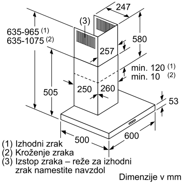 Dimenzije:- Dimenzije - odvajanje zraka (VxšxG): 635-965 x 600 x 500 mm