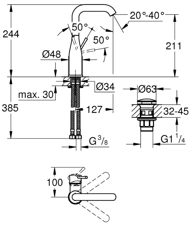 GROHE armatura za umivalnik Essence je enoročna stoječa armatura velikosti L, primerna za vgradnjo na eno odprtino. Kovinski ročaj, keramična kartuša in vrtljiva cevasta pipa z omejevalnikom zagotavljajo udobno, natančno in varno uporabo v sodobnih kopalnicah.