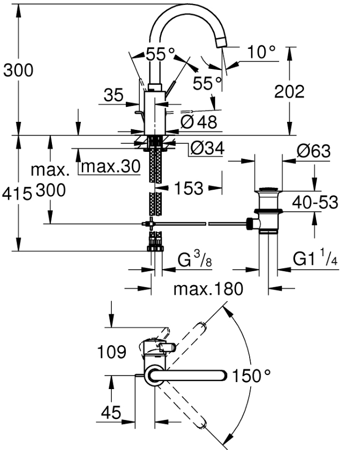Stoječa armatura za umivalnik GROHE Eurosmart Cosmopolitan 32830001 je enoročna armatura za vgradnjo na eno odprtino, namenjena sodobnim kopalnicam. Opremljena je s keramično kartušo, vrtljivo cevasto pipo s stop-omejevalnikom in nastavljivim omejevalnikom vodotoka za varčno in udobno uporabo.