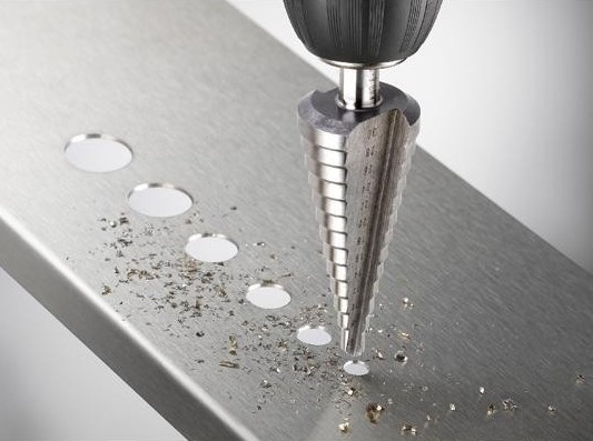 - Stopenjski HSS sveder, s starter točko za vrtanje od majhnih do velikih premerov s predhodnim vrtanjem v tanke pločevine