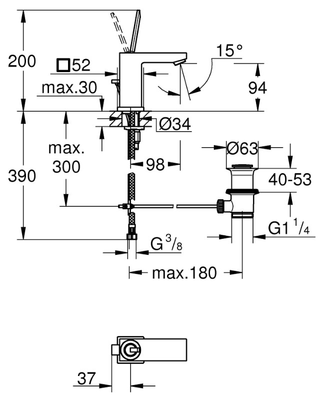 Stoječa enoročna armatura za umivalnik GROHE Eurocube Joy združuje sodoben kubističen dizajn z naprednimi tehnologijami za udobno, varčno in dolgotrajno uporabo. Namenjena je vgradnji na eno odprtino na umivalniku ter je opremljena z odtočno garnituro z dvižnim čepom 1 1/4".