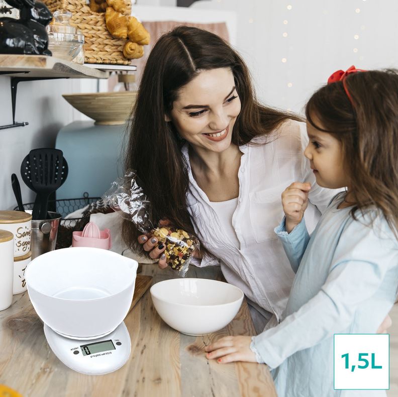 Digitalna kuhinjska tehtnica z odstranljivo posodo Digitalna kuhinjska tehtnica OBSKWB v kompletu s praktično odstranljivo 1.5L posodo je popoln partner v vaši kuhinji in zasede zelo malo prostora, hkrati pa močno olajša pripravo vsakodnevnih obrokov. Omogoča tehtanje sestavin do maksimalne teže 3 kg in se ponaša s funkcijo izničenja teže posode (TARA), tako da posledično njena uporaba postane še bolj preprosta in praktična. Tehtnica ponuja možnost merjenja v različnih merskih enotah kot so: grami (g) in britanske unče (oz).