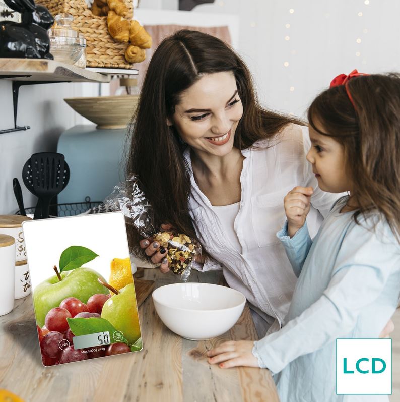 Natančno merjenje in LED zaslon Zagotovljeno je natančno merjenje sestavin zahvaljujoč zelo natančnim merilnim senzorjem. Zaradi svoje priročne velikosti in oblike je zelo priročna za shranjevanje. Samodejni vklop & izklop, opozorilo pred prazno baterijo in preobremenitvijo ter velik LCD zaslon zagotavljajo praktičnost in priročnost tehtnice, ki bo vsakemu uporabniku omogočala leta in leta vesele peke in kuhanja.