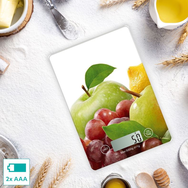 Moderna kuhinjska tehtnica. Kuhinjska tehtnica OMEGA OBSKWA je moderna in elegantna tehtnica, ki vam s svopjo neverjetno funkcionalnostjo olajša pripravo sestavin in kuhanje. Sprejema do 5 kg maksimalne obremenitve in ima funkcijo TARA za izničenje teže posode. Omogoča merjenje v različnih merskih enotah, prav tako pa lahko z njo izmerite tekočine. Tehtnica se samodejno vklopi in izklopi, vse natančno pridobljene podatke pa prikazuje na njej vgrajen LCD zaslon.