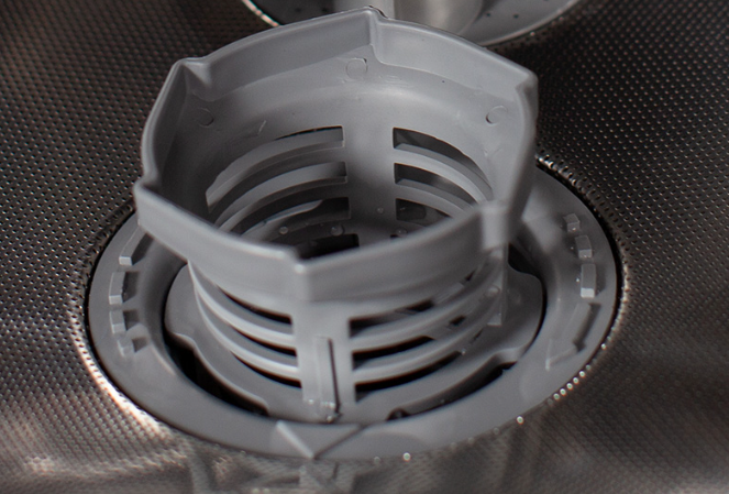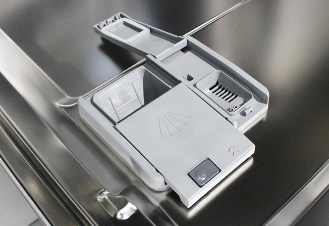Drsni dozirnik tablet omogoča tih izmet detergenta ter enakomerno raztapljanje za sijoče rezultate.