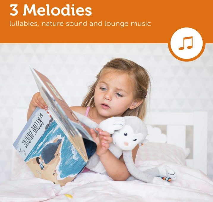 Predvaja tri različne melodije/zvoke, ki umirjajo in uspavajo malčke. Izbirate lahko med igranjem melodij najbolj znanih uspavank, glasba za sproščanje, glasbo in zvoki narave (gozd, petje ptic…). Omogoča izbiro dveh nivojev glasnosti.