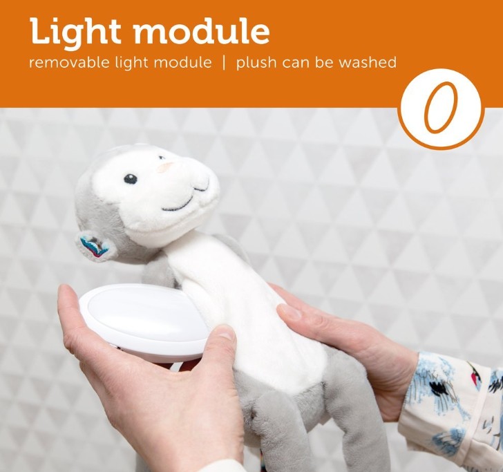 V trebuščku ima lučko s toplo svetlobo, ki nežno žari. Jakost svetlobe se lahko poljubno nastavi. Modul, ki se nahaja v trebuščku se lahko po želji odstrani.