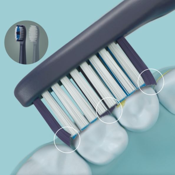Večnamenska ščetka ima edinstveno obliko ščetin s tremi robovi. Te prodirajo med zobe in temeljito očistijo celotno površino.