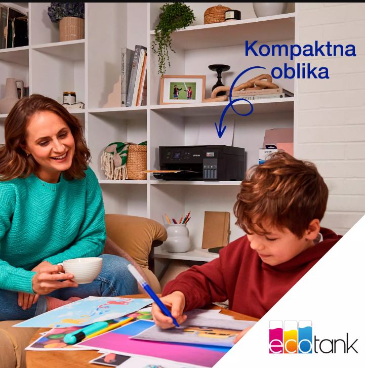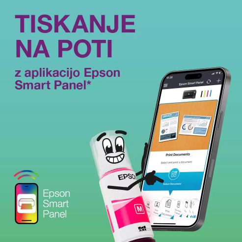 Vgrajen Wi-Fi in Wi-Fi Direct omogočata tiskanje od koder koli v domu, aplikacija Epson Smart Panel pa omogoča nastavitev, nadzor in tiskanje neposredno z mobilnega telefona ali tablice.