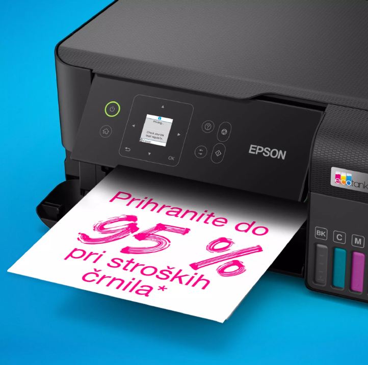 TISKANJE BREZ KARTUŠ! Epson EcoTank L3560 je vsestranska večopravilna naprava za domačo uporabo, ki omogoča izjemno nizke stroške tiskanja, brezžično povezljivost in enostavno upravljanje. Idealen je za šolarje, dijake in študente, saj omogoča tiskanje, kopiranje in optično branje brez zapletov ter z veliko količino priloženega črnila za dolgotrajno uporabo.