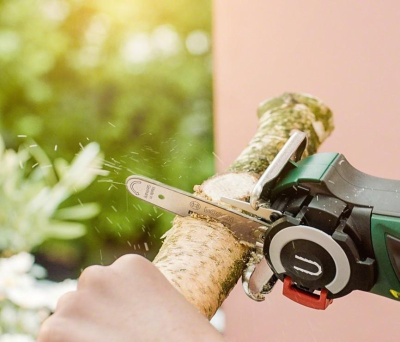 - Prenovljena oblika omogoča žaganje blizu robov, npr. gladko žaganje vej blizu debla