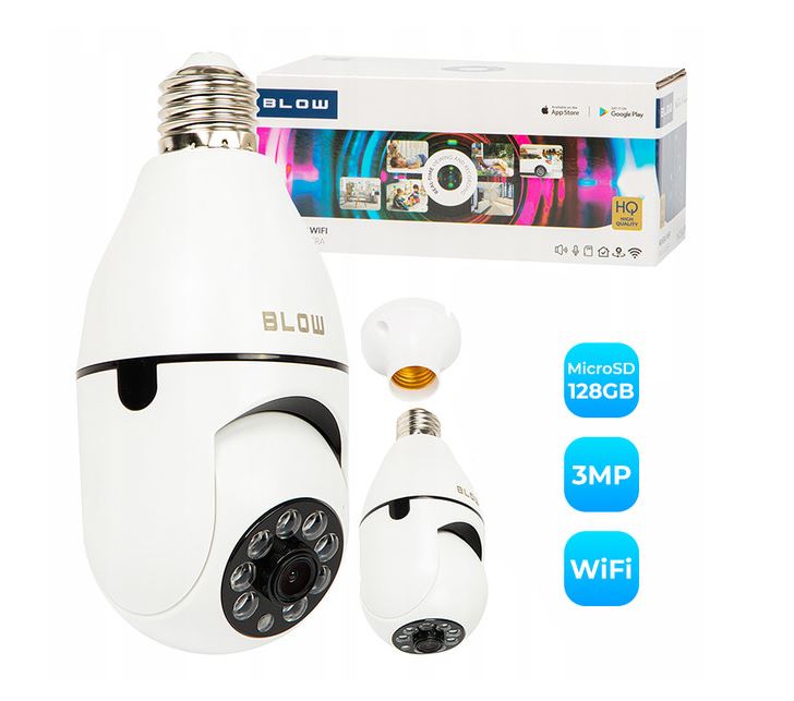 Izberite IP kamero BLOW H-933 in si privoščite popolnoma ugodno in pametno zaščito za vaš dom, stanovanje, hišo, sobo, pisarno, garažo ali objekt! Večfunkcijsko nadzorno WiFi kamero, ki jo priklopite v dozo za priklop luči odlikujejo izjemne in priročne lastnosti ter neverjetne specifikacije. Kamera zaznava gibanje in posnetke snema v vrhunski ločljivosti Super HD 3MP podnevi in ponoči. Snemanje v slabših svetlobnih pogojih in v temi do razdalje 10 metrov ji zagotavljajo vgrajene IR LED luči, posnetki pa se shranjujejo na microSD kartico do 128GB, ki jo vstavite v kamero. Pomembni in uporabni lastnosti kamere sta tudi WiFi povezovanje in napajanje preko E27 konektorja za priklop luči. Vgrajena sta tudi mikrofon in zvočnik, ki preko brezplačne aplikacije za Android in iOS (V380 Pro) omogočata enostavno dvosmerno komunikacijo.
