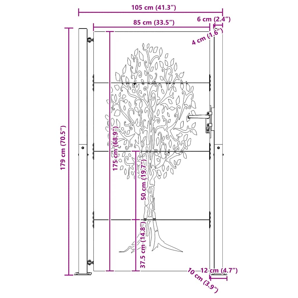 VIDAXL Vrtna vrata 100x175 cm iz kortenskega jekla z motivom drevesa