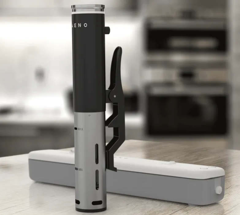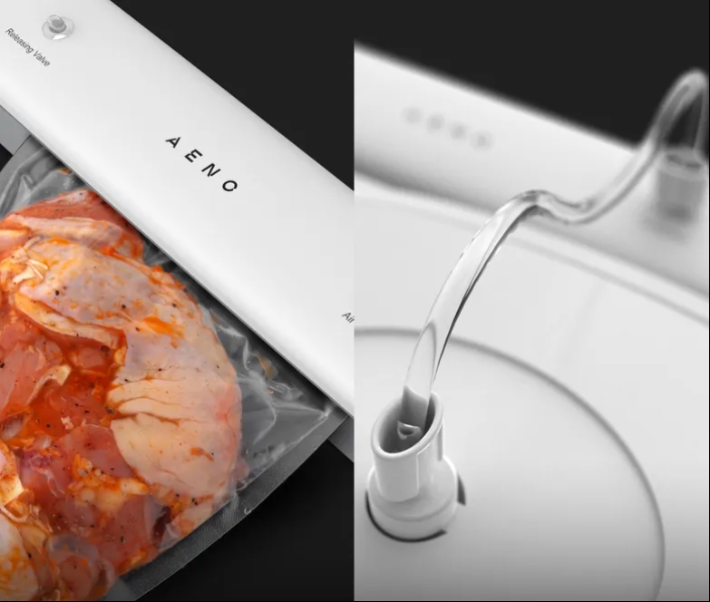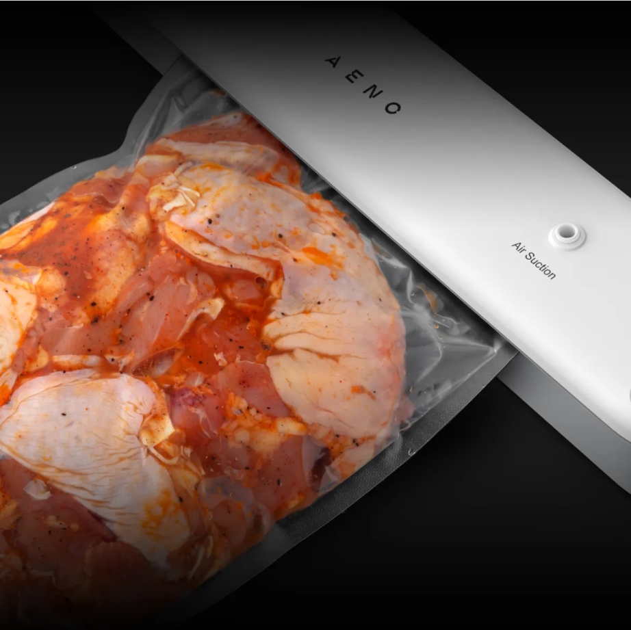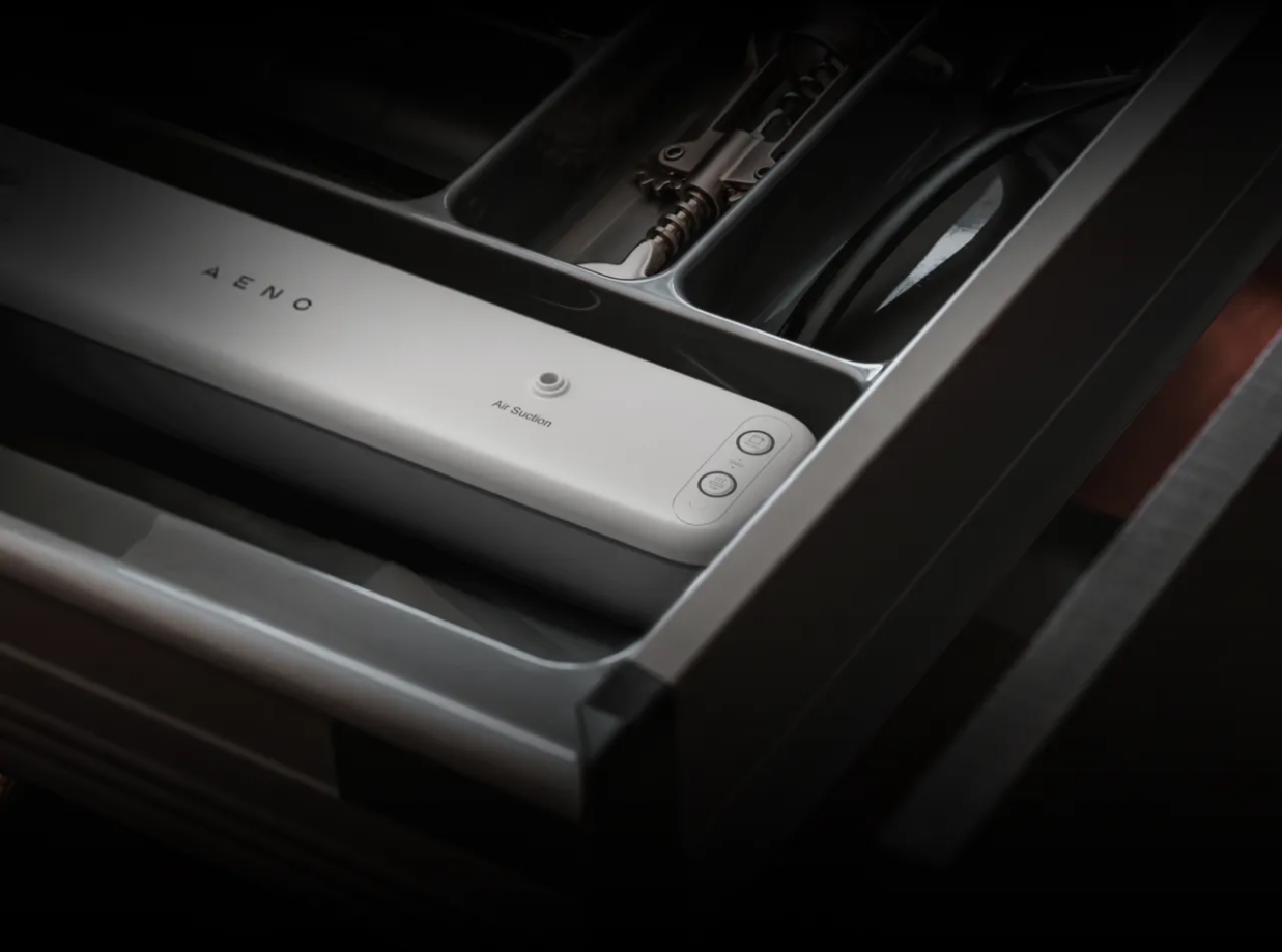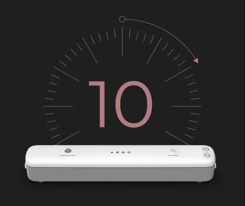 Vakuumski pečatnik AENO v dolžini 38 cm in debelini manj kot 6 cm ne zavzame veliko prostora in ga lahko namestite na vsako polico.