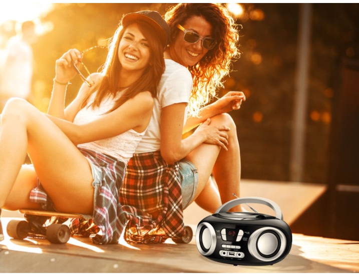 FM radijski sprejemnik: Zahvaljujoč možnosti predvajanja vseh FM radijskih postaj boste lahko hitro preklapljali med postajami, ki jih lovi teleskopska antena. Pozabite na dolgotrajno iskanje in uživajte v dostopu do svojih najljubših oddaj in glasbe. Kompaktne dimenzije:Priročne dimenzije zagotavljajo enostavno prenašanje radijskega sprejemnika, ter omogoajo, da ga vzamete s sabo povsod kamor greste! Radio ima dimenzije 265 x 225 x 130 mm in tehta samo 1060 gramov. LCD zaslon in gumbi: Zahvaljujoč velikemu, jasnemu in svetlemu LCD zaslonu na prednji strani Boombox predvajalnika bo upravljanje postalo zares intuitivno in enostavno. Vgrajeni gumbi za nastavljanje omogočajo prilagajanje vseh funkcij, načinov in glasnosti.