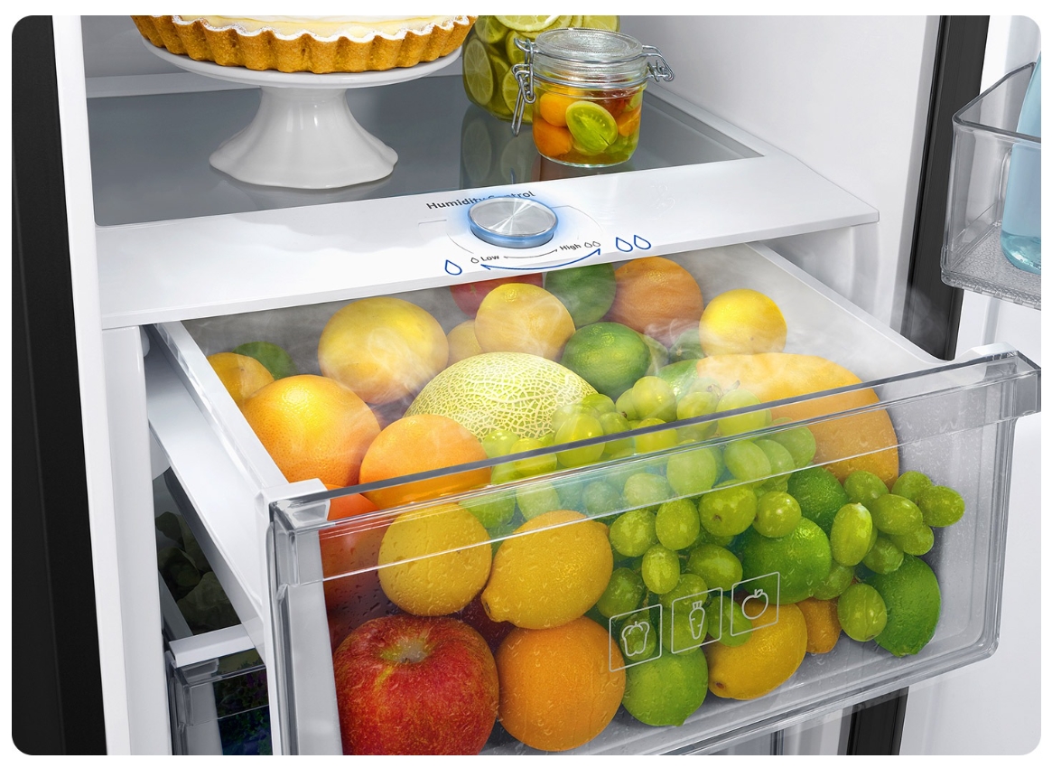 Škatla za zelenjavo z nadzorom vlažnosti. Ohranite še več sadja in zelenjave sveže dlje časa v škatli za zelenjavo z nadzorom vlažnosti, ki je dovolj velika za shranjevanje velikih živil. Nenehno prilagaja stopnjo vlage za vzdrževanje optimalne vlažnosti z avtomatskim odpiranjem in zapiranjem zračnika za zadrževanje ali izpuščanje vlage.