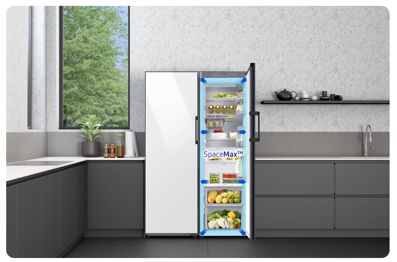 SpaceMax™ tehnologija. Shranite več živil v zelo prostorno notranjost. Edinstvena SpaceMax™ tehnologija uporablja posebno uretansko izolacijo, zaradi katere so stene hladilnika lahko veliko tanjše, ne da bi to zmanjšalo energetsko učinkovitost. Zato se v notranjosti sprosti dodaten prostor brez povečanja zunanjih dimenzij.