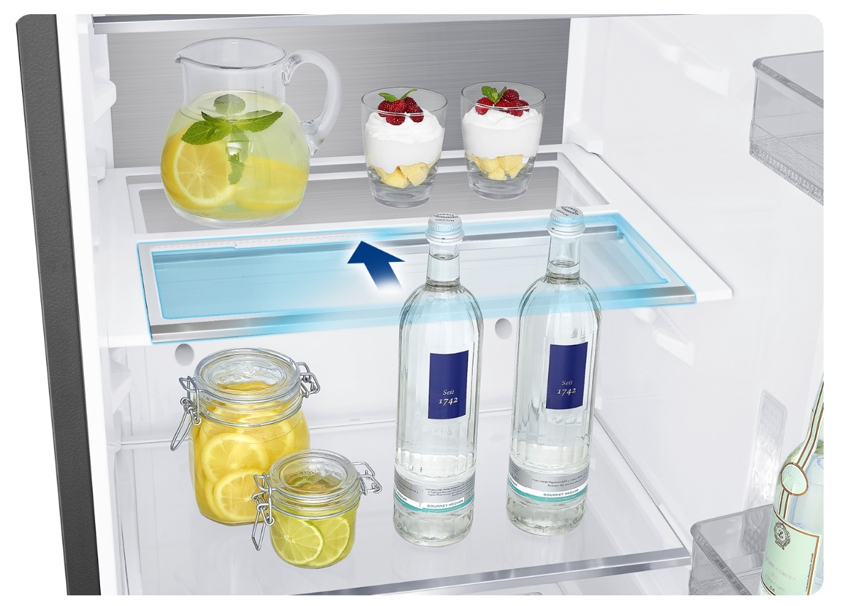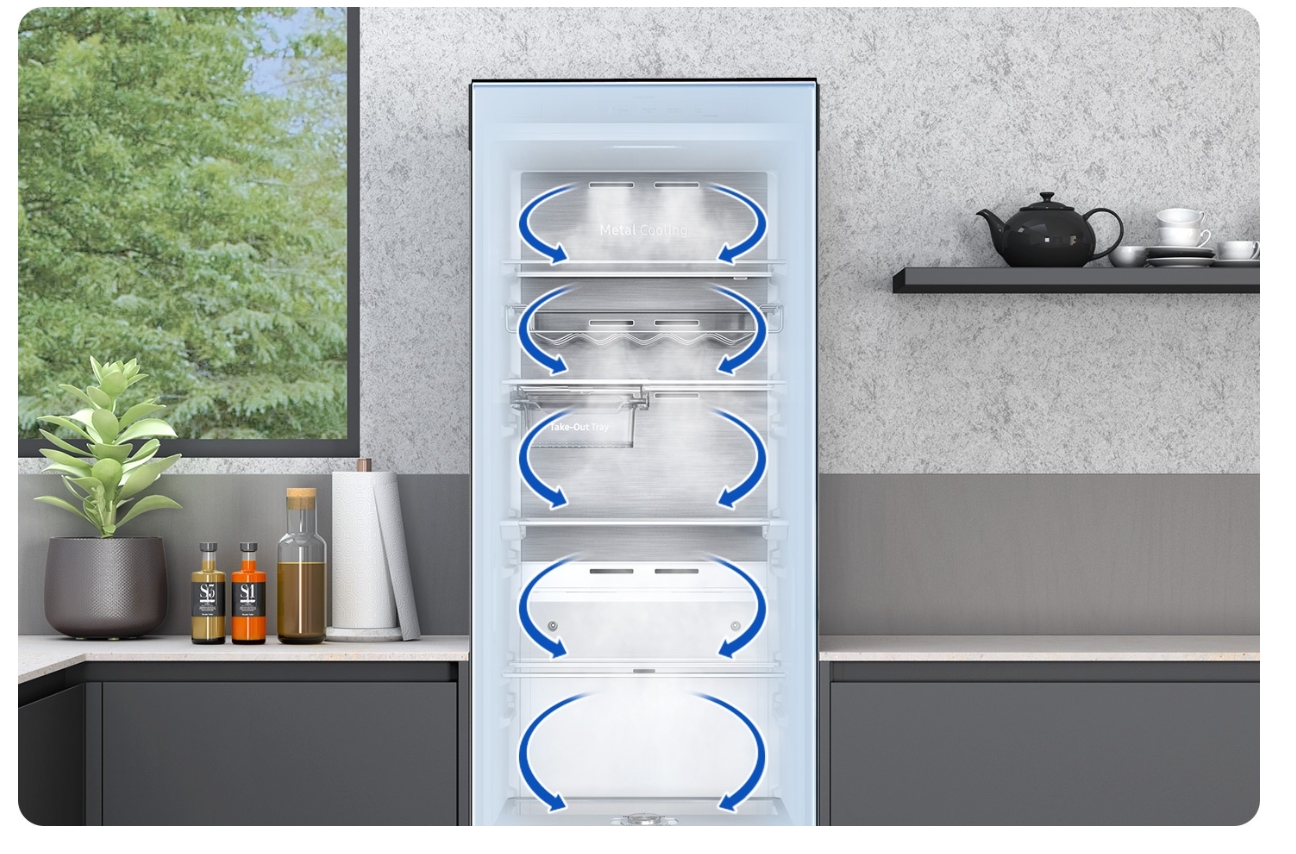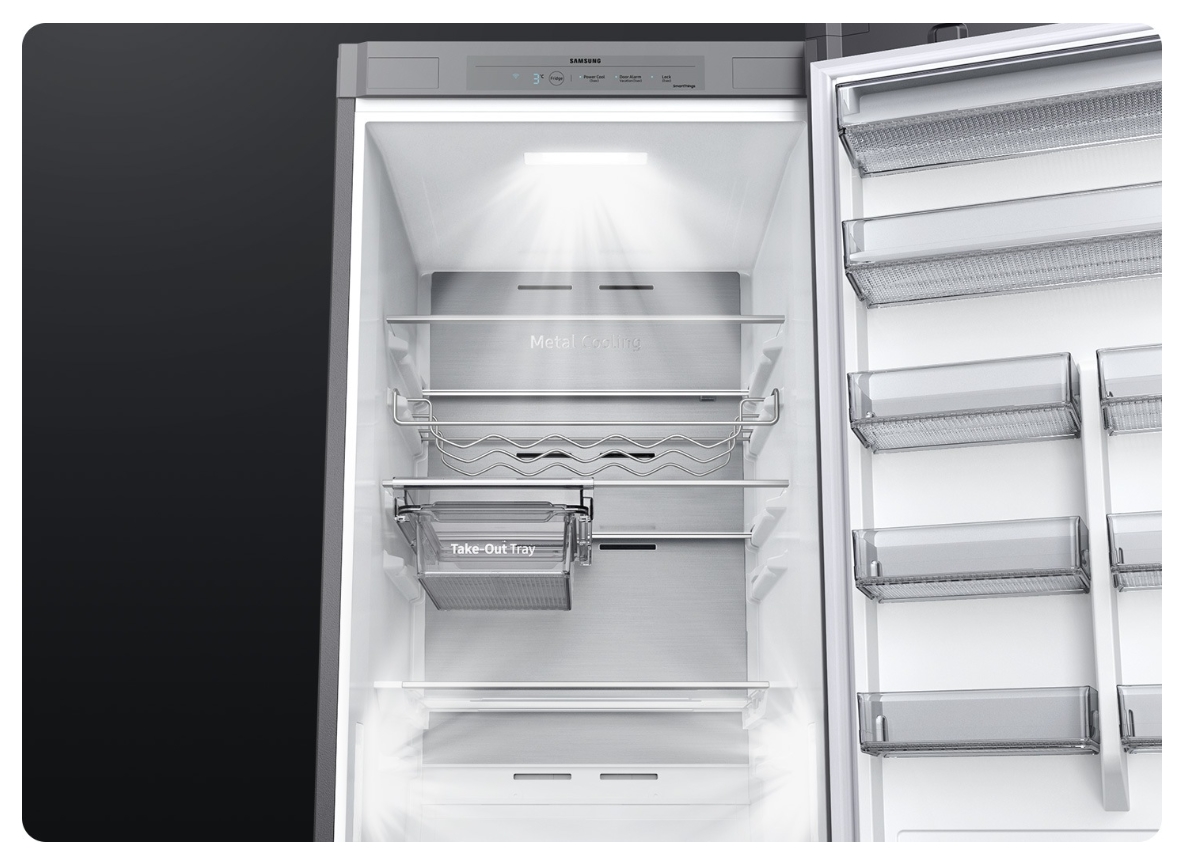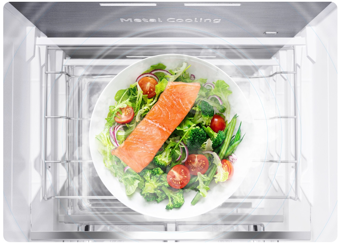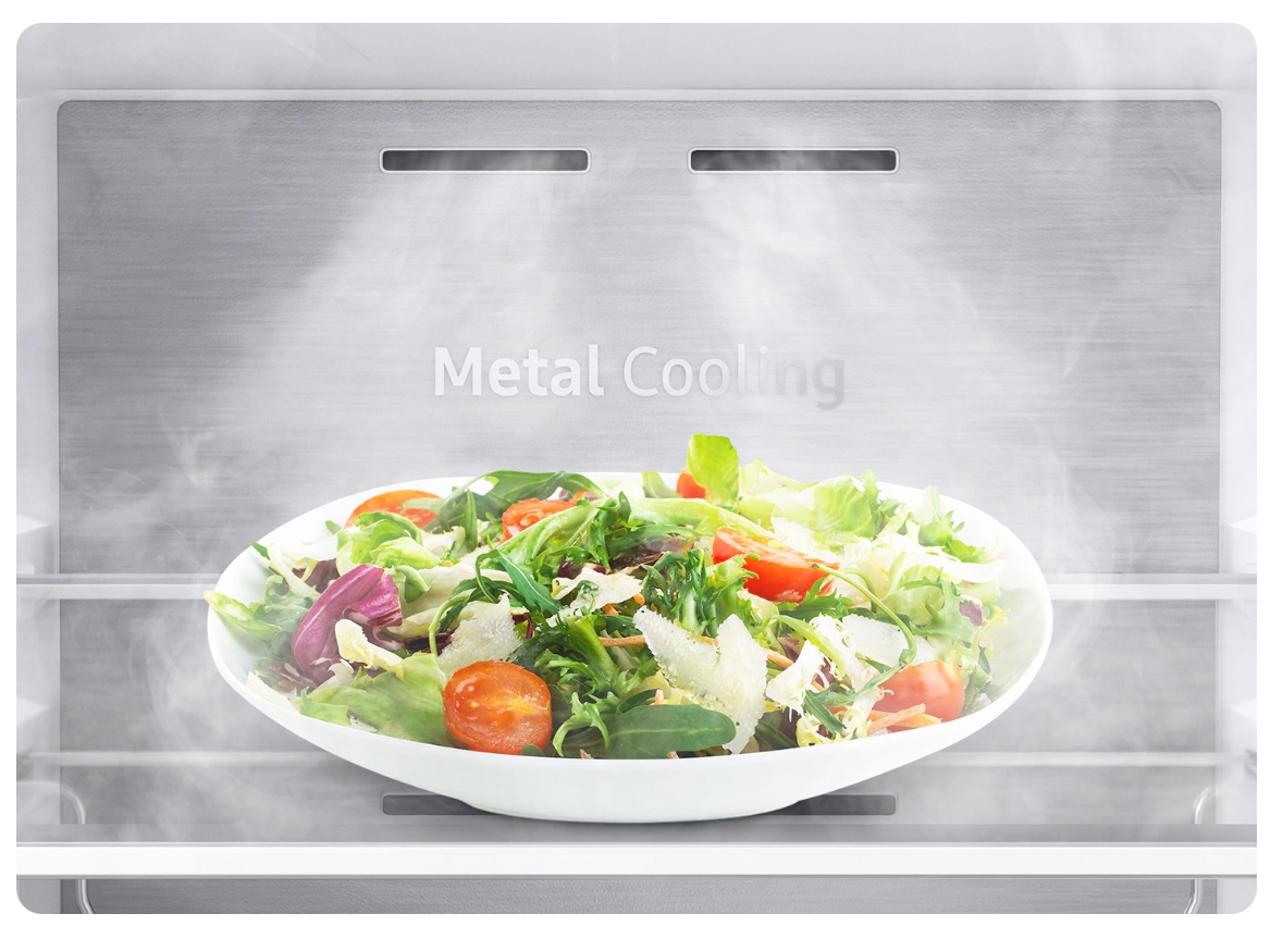 Hlajenje s kovino. Vzdržuje optimalno temperaturo v notranjosti hladilnika, zato živila ostanejo sveža tudi ob pogostem odpiranju in zapiranju vrat. Kovinska hladilna plošča na zadnji steni ohranja hlad iz zraka in pomaga hitro obnoviti izgubo toplote. Poleg tega daje hladilniku vrhunski videz in jo je zelo enostavno očistiti z brisanjem.