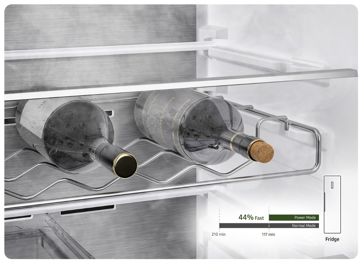 Power Cool funkcija. Uživajte v zmogljivosti hitrega hlajenja za veliko hitrejše hlajenje živil in pijače. Ob dotiku gumba začne Power Cool funkcija pihati izjemno hladen zrak v hladilnik. Tako lahko hitro ohladite tedenski nakup živil ter ohranite njihovo svežino in aromo ali hitro ohladite svoje najljubše pijače za zabavo ali večerjo.
