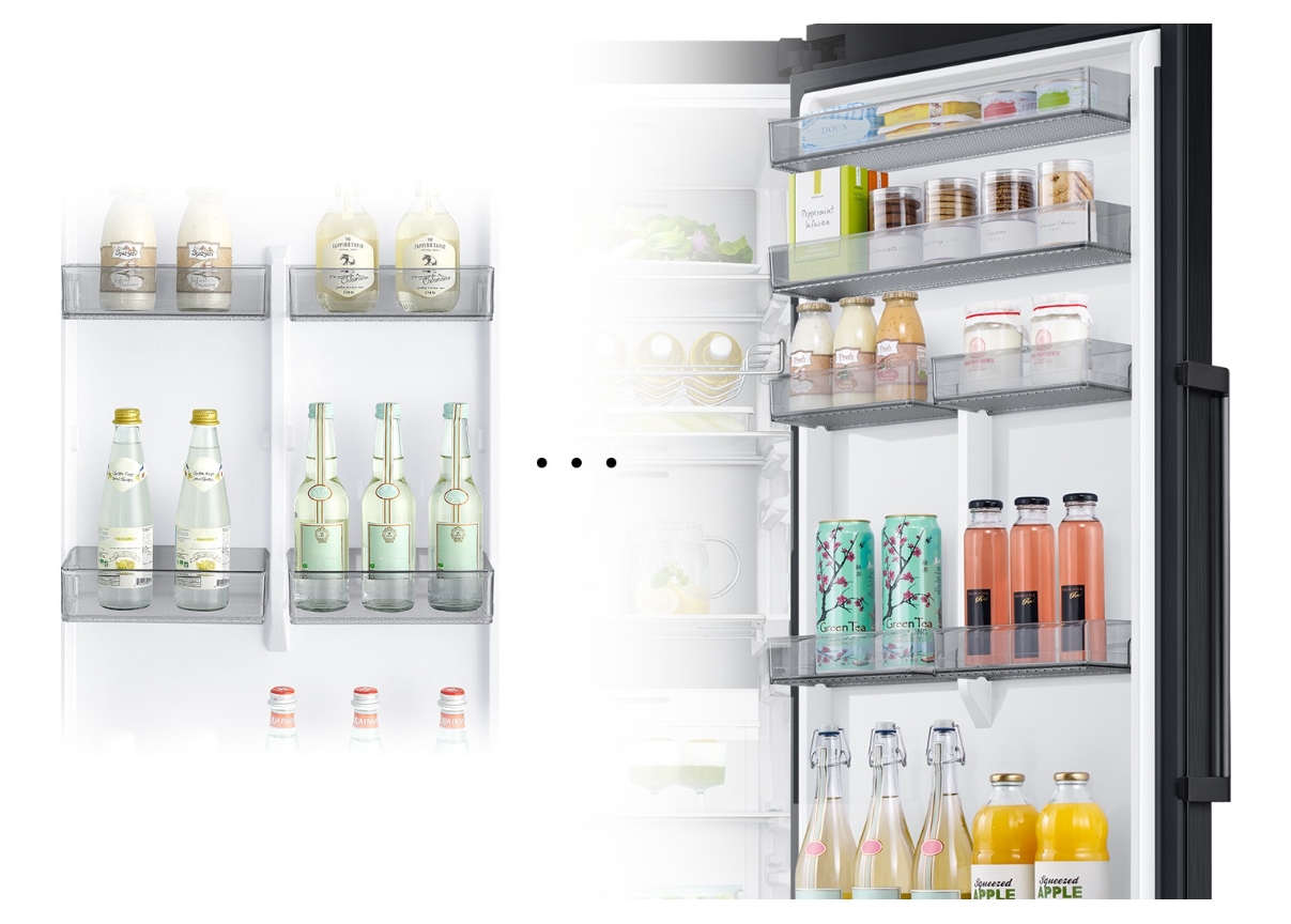 Prilagodljiv predal v vratih. Izkoristite prostor na vratih hladilnika bolj prilagodljivo. Štiri prilagodljive predale na vratih je mogoče individualno prilagajati in jih premikati gor ali dol za shranjevanje steklenic, tetrapakov in druge embalaže vseh velikosti, tudi če so velike ali neobičajne oblike. Pomaga tudi zagotoviti, da ostanejo na svojem mestu in ne padejo ven.