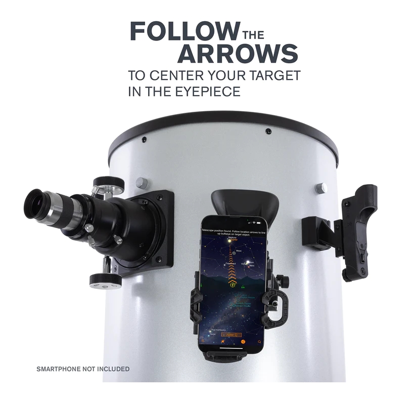 Zapustite zapletene zvezdne karte, nenatančne aplikacije za planetarij in računalniške montaže. S StarSense Explorerjem iskanje objektov še nikoli ni bilo lažje, hitrejše in natančnejše. V nekaj minutah po nastavitvi teleskopa boste samozavestno krmarili po nebu. Preprosto postavite telefon v edinstveno priklopno mesto StarSense in zaženite aplikacijo StarSense Explorer. Ko telefon poravnate z optiko teleskopa (hiter in enostaven postopek), program StarSense Explorer ustvari seznam trenutno vidnih nebesnih objektov. Izberite in na zaslonu se prikažejo puščice, ki vas vodijo pri premikanju teleskopa. Ko je objekt pripravljen za ogled v okularju, se kroglica obarva zeleno. Med opazovanjem lahko poslušate na stotine zvočnih opisov in si ogledate podrobne informacije o več tisoč objektih v obsežni podatkovni zbirki aplikacije.