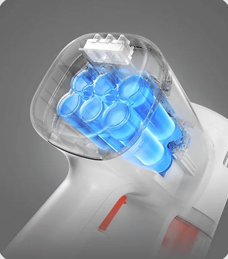 Vgrajena baterija s kapaciteto 2200 mAh omogoča do 45 minut delovanja z 2-v-1 nastavkom ali do 40 minut z električno krtačo, kar zadošča za temeljito čiščenje večine doma brez prekinitev.
