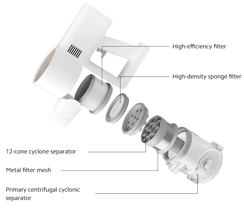 Sesalnik uporablja 5-stopenjski precizni filtrirni sistem z učinkovitostjo filtriranja 99,9 %, ki zajame delce velikosti do 0,3 μm in sprošča čist zrak za zaščito zdravja vaše družine.