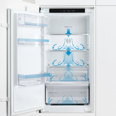 Neenakomerna temperatura v hladilniku lahko vpliva na okus in rok trajanja hrane.Eco Airflow skrbi za enakomerno razporeditev vlažnosti in temperature, tako da vaša živila ostanejo sveža dlje.