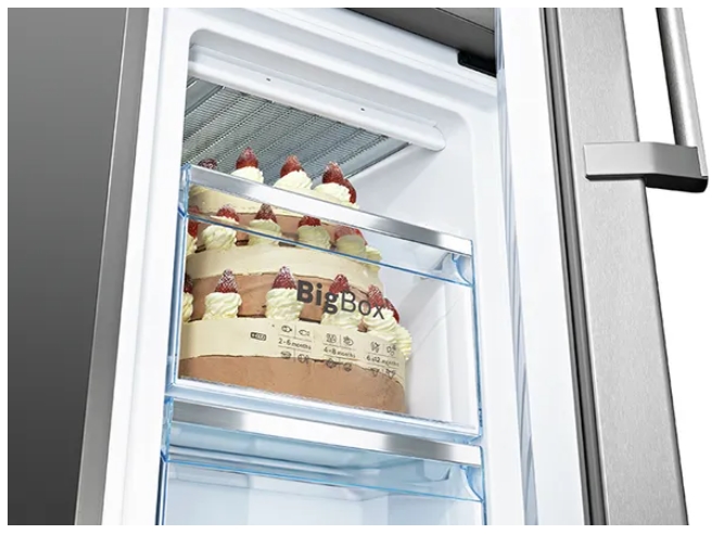 Posebej globok predal za zamrznjena živila za praktično zlaganje posod z zamrznjenimi živili ali večjih zamrznjenih živil, kot so torte ali pice. Ne glede na to, ali morate prirediti otroško rojstnodnevno zabavo ali zamrzniti poročno torto – v predalu Big Box boste našli dovolj prostora za večja zamrznjena živila.