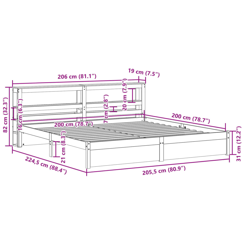 VIDAXL posteljni okvir z vzglavjem, trden borov les, naravna, 200×200 cm