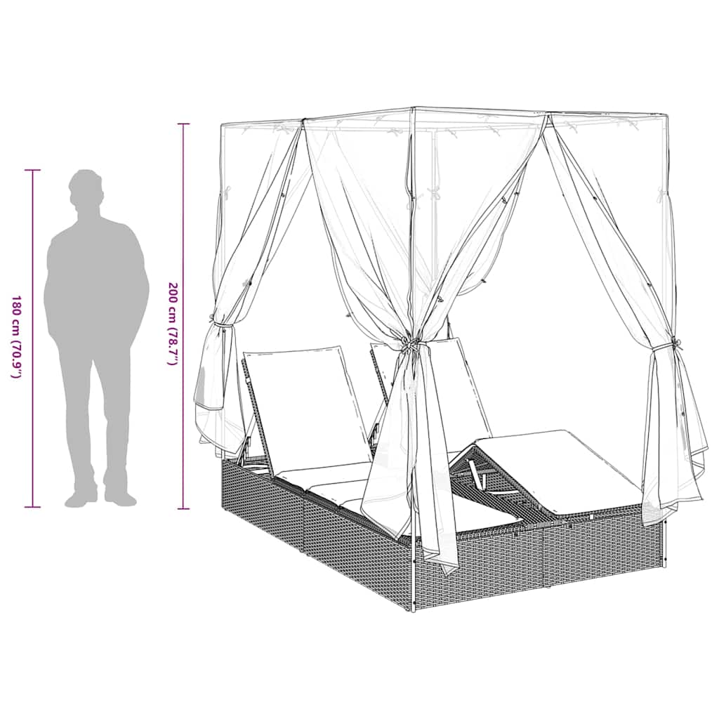 Gladke linije in moderna estetika ta ležalnik naredijo za super izbiro v vsakem zunanjem okolju. Eleganten streha in usklajene zavese omogočajo, da ustvarite svoj osebni zunanji prostor. Prostorna dvojna zasnova nudi dovolj prostora za dve osebi, kar ga dela idealnega za pare ali obiske. Ne glede na to, ali se sončite ali uživate v senci, ta ležalnik zadostuje vsem vašim željam in potrebam.
