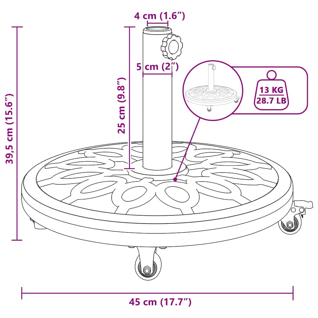 Ta osnova za dežnik je vaša najboljša podpora za zunanje dežnike, idealna za zagotavljanje stabilne sence, tudi ko piha veter. Ima svež, modern videz s čistimi linijami, ki se odlično ujemajo z vsakim zunanjim slogom. Zgrajena, da zdrži, ta osnova prinaša trdno in moderen občutek, kar jo dela izvrstno za vrtove in terase ter povečuje udobje in stil v vašem zunanjem okolju.