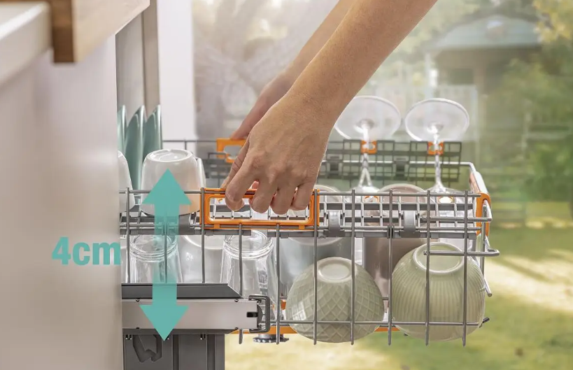 Nastavljiva zgornja košara deluje kot pladenj za pribor ter organizira posamezne kose za optimalno čiščenje in sušenje.