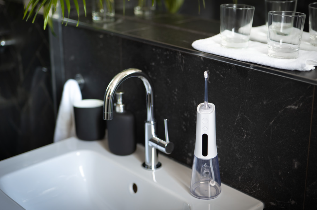 300 ml posoda zadostuje za čiščenje celotnega zobovja in je hkrati dovolj kompaktna. Poleg navadne vode ga lahko napolnite z ustno vodico za dodatno svežino.