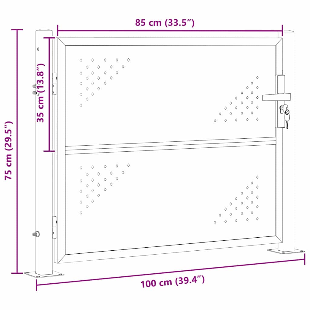 Ta moderna vrtna vrata združujejo funkcionalnost in stil ter ponujajo enostavno pravokotno obliko, ki zagotavlja varnost na vaših zunanjih površinah. Narejena so iz nerjavečega jekla, ki se blešči in se lepo ujema s sodobno estetiko. Idealna so za ljudi, ki cenijo zasebnost in varnost, saj ponujajo zanesljivo in privlačno rešitev za zunanji prostor.